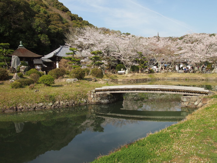 | 大阪から車で26号線を和歌山方面に走り、和泉砂川から東に県道泉佐野・岩出線に入り、新風吹トンネルを 抜けて1つめの信号を左折すると根来寺に着きます。 光明真言殿の前の桜 光明真言殿の中と外の池を写す。行者堂、聖天堂を拝観して光明真言殿に戻り、反対側の本坊に行く。 本坊と庭を拝観する。 新義真言宗の管長職を兼ねる寺の座主の住坊。この内には紀州徳川家から拝領した建物で湊御殿、 名草御殿、別院などがあります。 庭園は国から名勝として指定され、自然の滝と池を配した名園です。 この庭には、鶴と亀が配置してあると、片隅に張ってあった案内書に書いてありました。 外に出て、本坊の前を通り国宝大塔へ行く。 国宝大塔と大師堂。 国宝大塔の中を拝観して大傅法堂に向かう。 大傅法堂と国宝大塔の前から桜を入れて写す。 奥の院へ行く。 駐車場へ向かう途中、大谷川沿いの遊歩道を見つけてそれを行く。 鐘桜門の筋に出て、鐘桜門まで石段を上りそれを潜って光明真言殿に戻った。 名勝浄土池から桜が満開の聖天堂、行者堂、光明真言殿を観る 名勝浄土池からの景色に満喫し、鐘桜門から石段を下って戻る。 露店を前を通り抜け、道路に出たら車道の向こうに枝垂桜が目に付き見に行く。 駐車場に戻り、綺麗な桜を撮る。 車で大門に行く。 桜が満開で仁王様もご満悦のようでした。 比較的近い「めっけもん広場」により買い物をして帰りました。 |