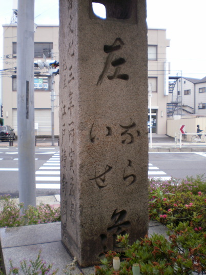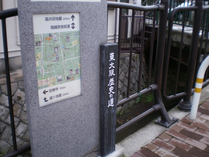玉津橋を渡った所に「暗越奈良街道」と石の道標がある。そこから少し右斜めに街道が曲がって行き